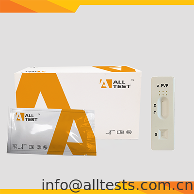 The α-PVP Surface Test is a rapid immunochromatographic assay for the qualitative detection of alpha-Pyrrolidinovalerophenone at the cut-off of 1000 ng/mL.